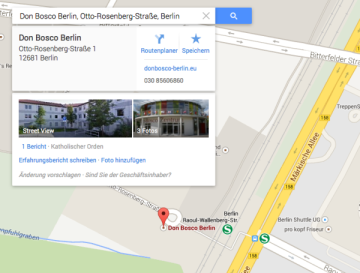 Das Don-Bosco-Zentrum liegt im Nordosten Berlins im Stadtbezirk Marzahn-Hellersdorf mit guter Verkehrsanbindung. Die S-Bahn-Station Raoul-Wallenberg-Straße der Linie S 7 ist nur eine Gehminute vom Don-Bosco-Zentrum entfernt. Den Berliner Hauptbahnhof erreichen sie in 29 Minuten; zum Alexanderplatz sind es ein paar Minuten weniger.